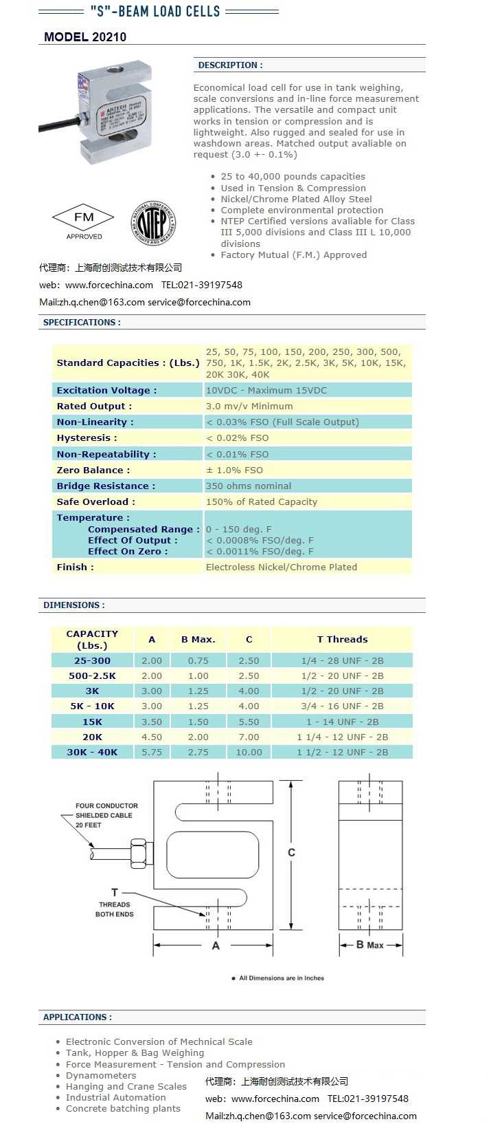 美國Artech標準S型測力傳感器Model20210/S型拉壓力傳感器/25到40000磅的量程選擇