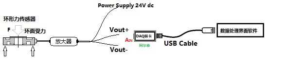 傳感器(原始mV信號)—放大器(標準模擬量)—數(shù)據(jù)采集卡(通過USB)—電腦界面軟件(基于NI LabView編程)。